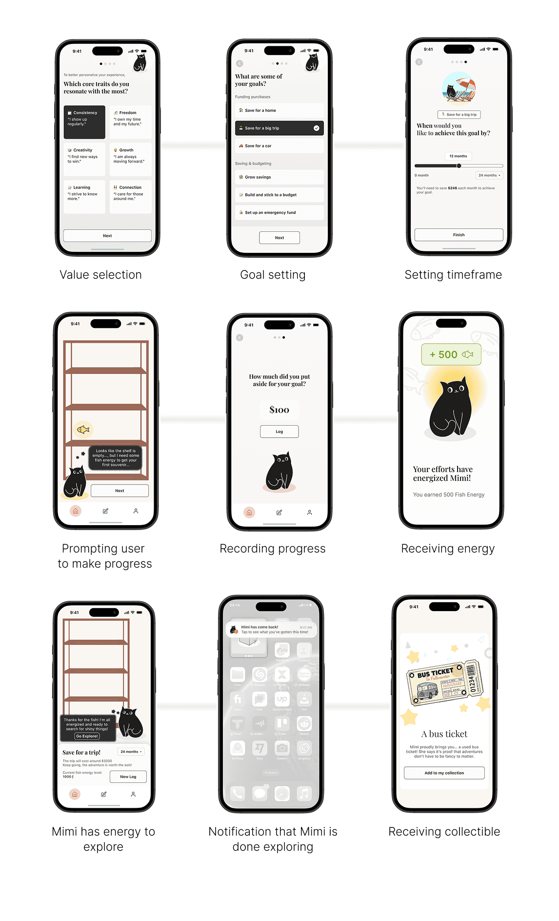 Users define values and set specific goals with deadlines (SMART framing). Each saving log is intentionally small and bounded, followed by immediate emotional feedback and visible progress toward a meaningful reward. Rewards are designed to reflect users' identity and goals, not random points.