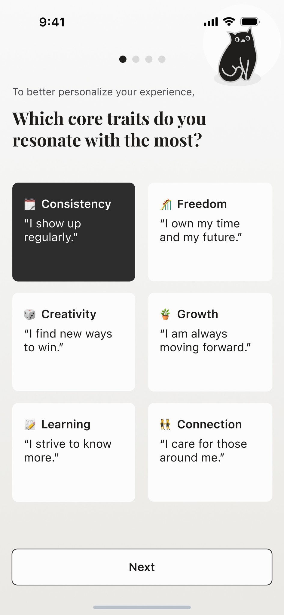 I included quotes for each value to clarify abstract concepts. By reframing the prompting question, I encourage users to commit to goals aligned with who they truly are, not external pressure.